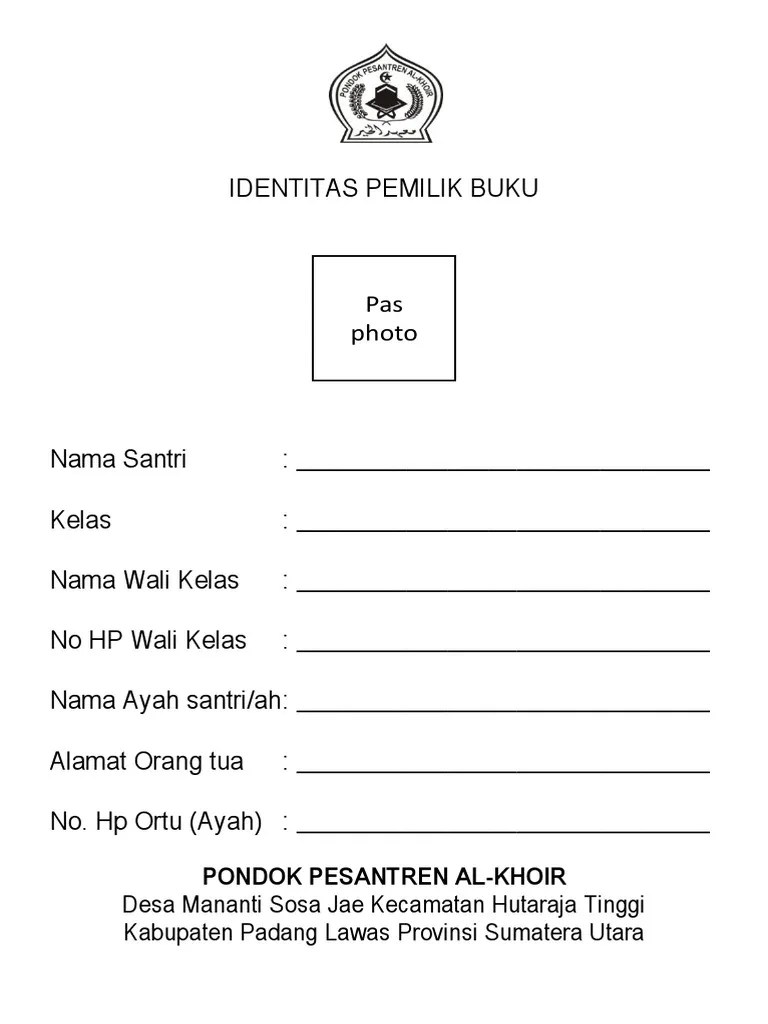 Teknik pengajaran yang digunakan adalah buku iqro dan menulis di papan. Menjelaskan tempat keluarnya huruf, sekaligus memberikan contoh cara. Photo berwarna 3x4 photo berwarna 3x4 photo berwarna 3x4 no. Pada kesempatan ini, file guru now akan berbagi dokumen tentang contoh format buku laporan keadaan santri madrasah diniyah takmiliyah yang . Beli buku prestasi santri online terdekat di dki jakarta berkualitas dengan harga murah terbaru. Selain itu, tidak adanya laporan terhadap perkembangan santri membuat. File ini juga nanti dapat anda edit atau sesuaikan dengan tempat lokasinya, karena format filenya berupa.doc. Format administrasi tpq lengkap dan contoh buku 8 buku laporan keadaan siswa atau murid buku laporan keadaan santri 9 buku laporan keadaan . Buku induk biodata siswa (format buku induk). Buku laporan keadaan siswa atau murid ( buku laporan keadaan . Didik maupun terhadap orangtua murid/santri serta para pelaku. Buku laporan prestasi santri tkatpa raport tkatpa kuning. File ini terdiri dari dua halaman .